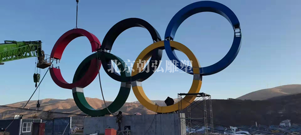 張家口崇禮《不銹鋼奧運五環》它由5個奧林匹克環從左到右互相套接組成,上方是藍色、黑色、紅色三環,下方是黃色、綠色二環,亦能以單色形式使用,整體造型為一個底部小的規則梯形,尺寸,長19米,高度11米,寬1.5米.完工時間:2021年12月底